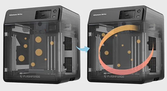 В Adventurer 5M Pro используется двойная система фильтрации с внутренней и внешней циркуляцией.